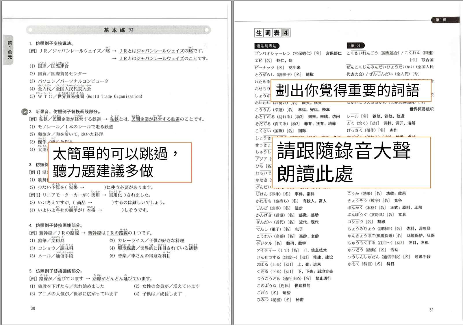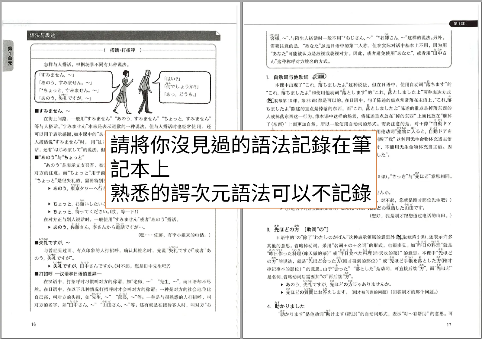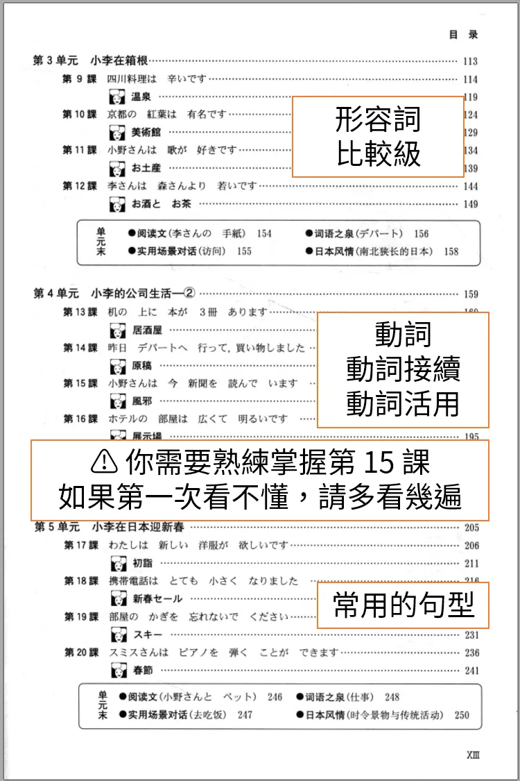 先來看一下中級日語的課本結構。中級的上下冊共有 32 課,其中每一課中是長這樣的。