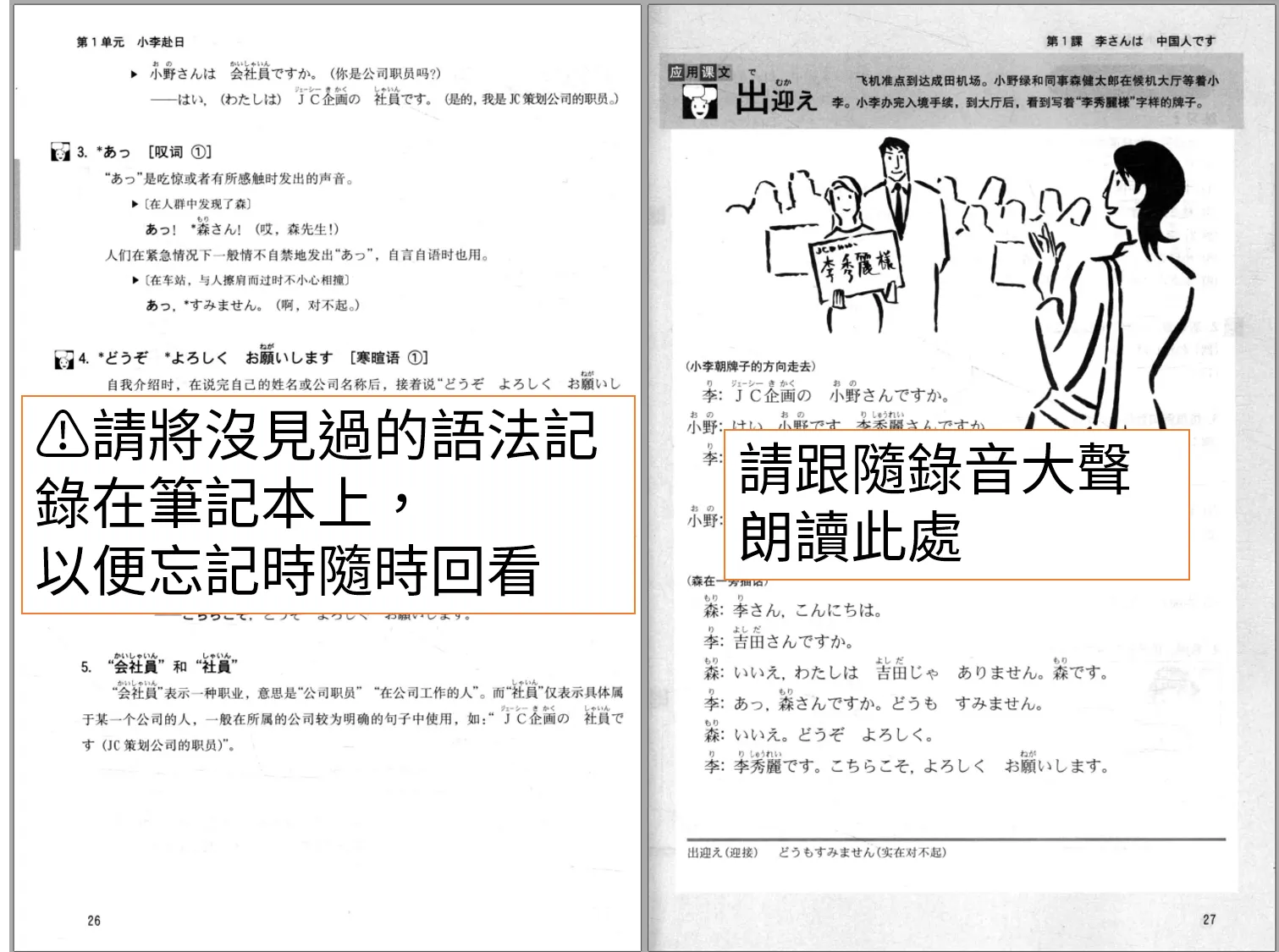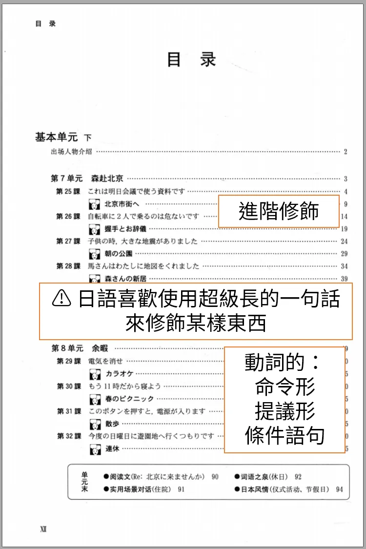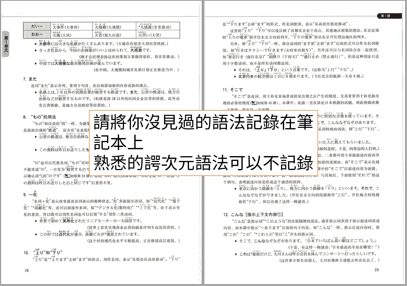 先來看一下中級日語的課本結構。中級的上下冊共有 32 課,其中每一課中是長這樣的。
