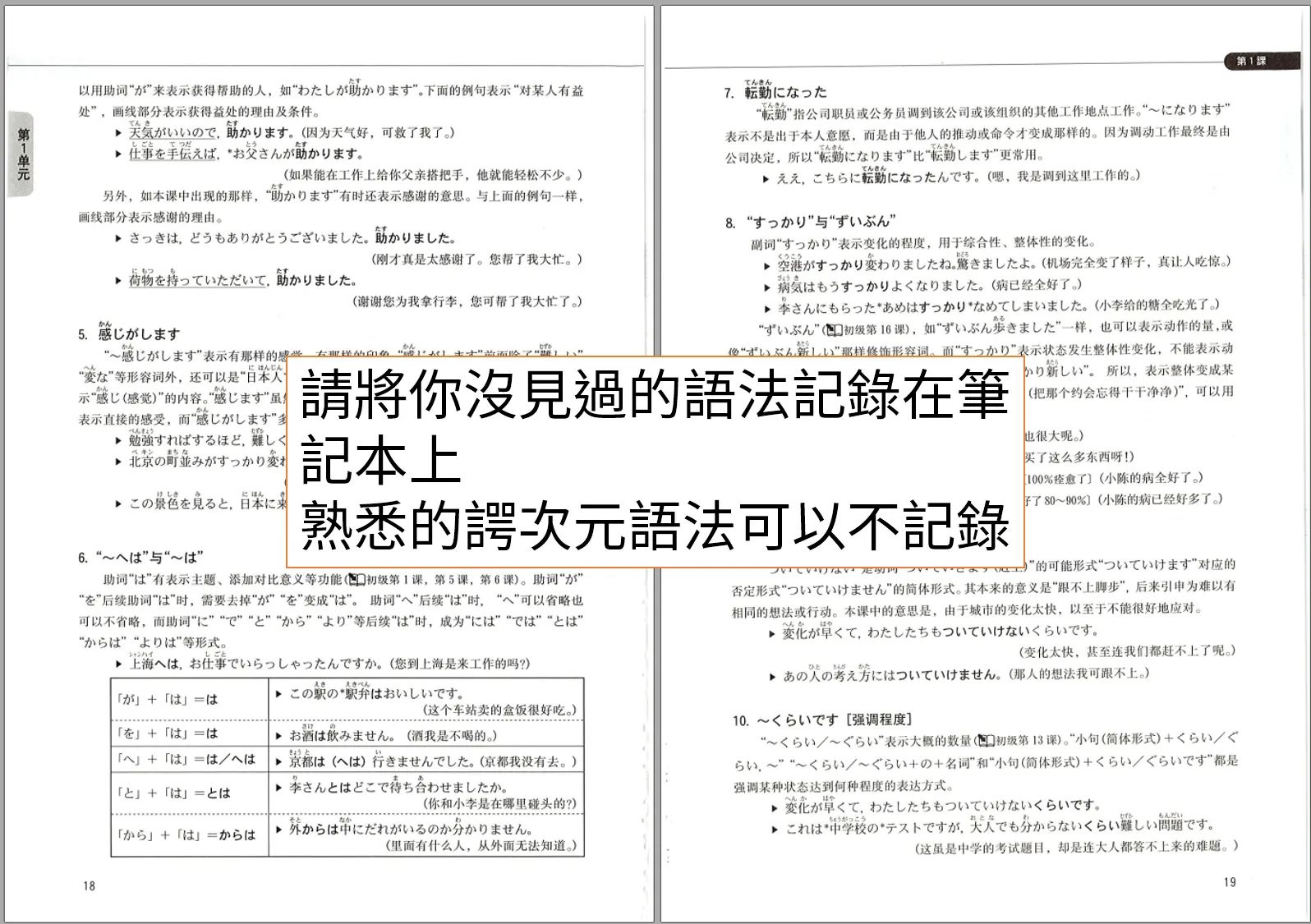 但是如此高強度的學習會導致心累,所以我執行這個計劃的時候,每星期安排了一天的休息,啥也不做。這樣就可以半個月完成上冊。上冊的最後有一套 N5 考試題,請花一天時間完成牠,並仔細批改糾錯。