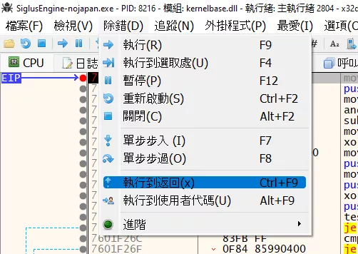 然後選擇「執行到返回」,此時 EIP 會停在一個 return 上面,再按 F7 執行一條指令: