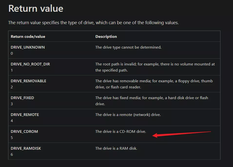 查了一下微軟的文檔,我們瞭解到如果返回值是 5,那麼表示這個盤是一個光盤,