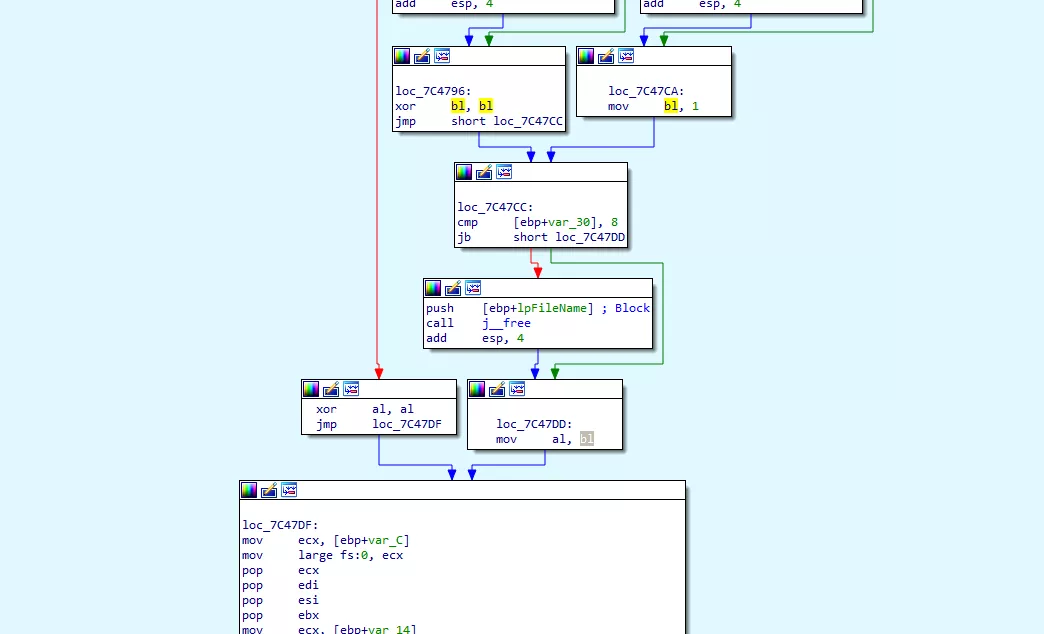 可以看到,在進行 GetDriveType 之後,根據結果不同程序分爲兩條路,