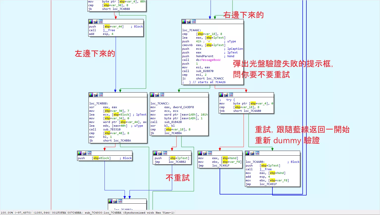 左邊那條紅線下來就是一個 xor al, al 將返回值清零,因此我推斷如果光盤驗證返回了 0 值,代表系統中沒有光盤,則 dummy 測試會直接跳過,然後返回一個失敗。