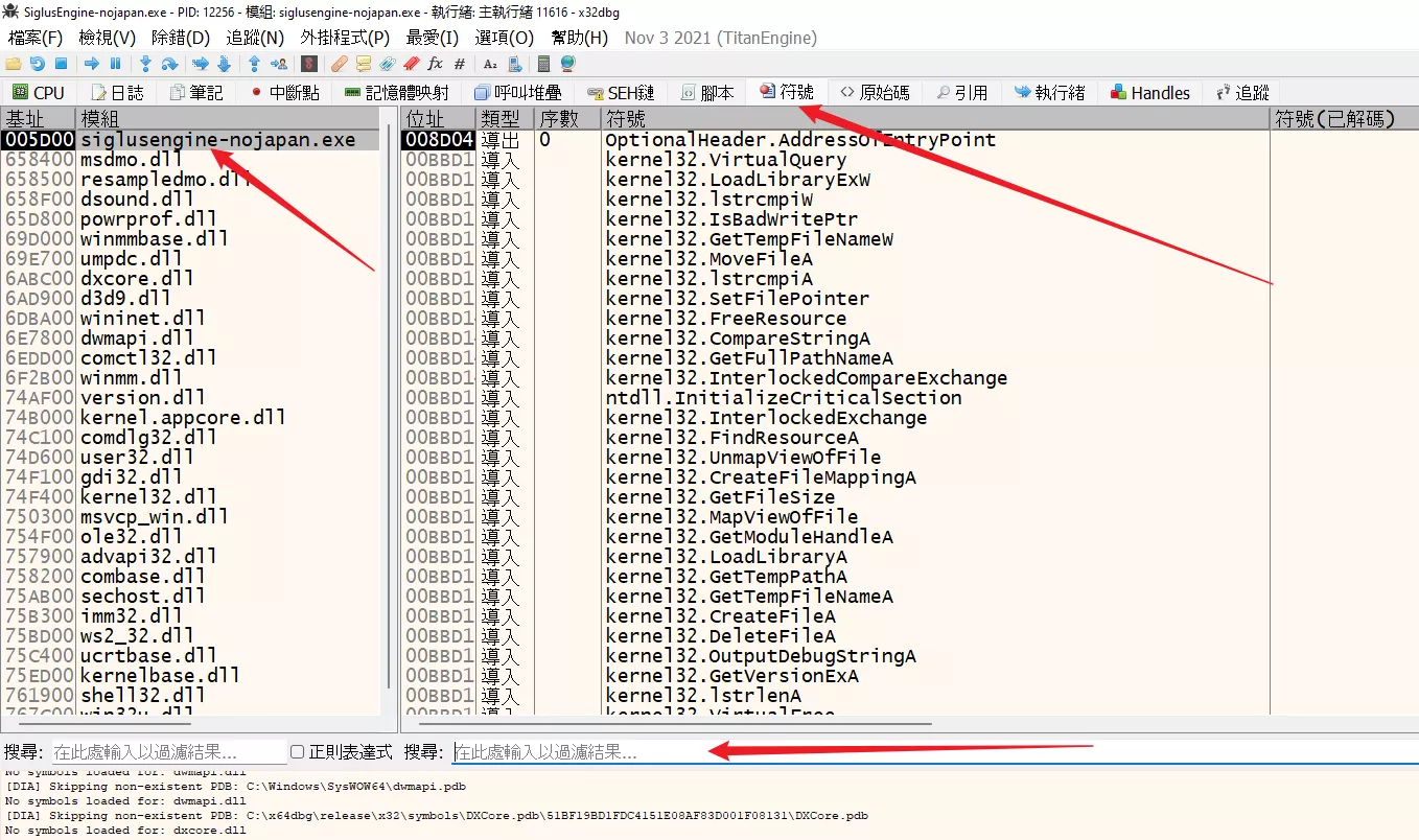 進入「符號」頁面,左上角選遊戲主程序,右邊就會列出遊戲中所用到的 API,