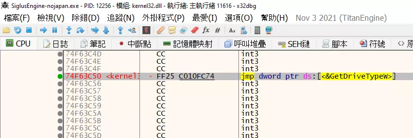 如果 Galgame 確實調用了 GetDriveType 的話,那麼在進行光盤驗證的時候將會自動暫停在紅色的地方。
